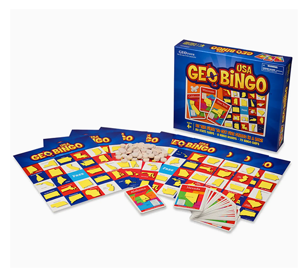 GeoBingo World from GeoToys®, out of Neenah, Wisconsin is easy to play – works just like the bingo you know, with a geographic twist! The game includes 8 bingo boards with 25 countries on each board, 50 country cards with each country’s capital, land area, population and geographic location. Includes plenty of wooden bingo chips. First one to get five countries in a row wins!