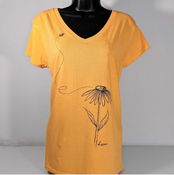 This limited-edition Honey Bee Tee is an original, hand drawn design by Eshter Hill of Happy Harbor T-shirt Company, Mineral Point, Wisconsin. A tri-blend of materials makes this lovely t-shirt silky soft and a joy to wear. Loose, drapey-fit; size down if a more fitted tee is desired. Get it while you can.