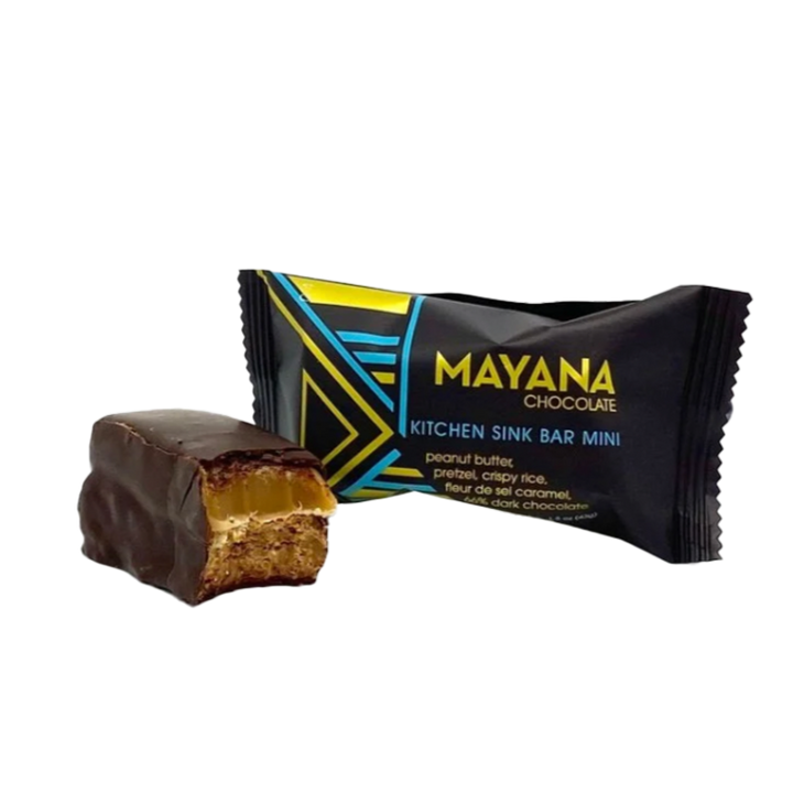 Everything you need to indulge your sweet tooth; peanut butter, pretzel and crisp rice with milk chocolate, fleur de sel caramel and 66% dark chocolate for a taste experience unlike any other. From Mayana Chocolate.